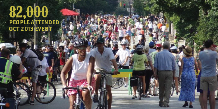 Over 100,000 people attended the last Atlanta Streets Alive event of 2014, to run, walk, ride, dance and play in the streets. The 4.5 mile loop connected five neighborhoods via four main streets: North Highland Ave + Highland Ave+ Boulevard + North Avenue. T