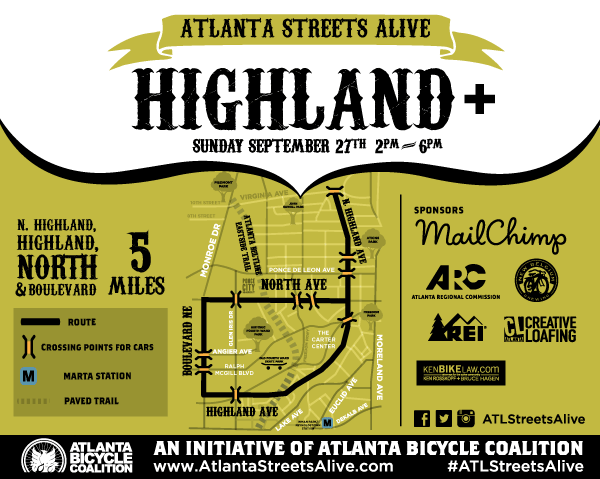 The Atlanta Bicycle Coalition is excited to bring Atlanta Streets Alive back to Highland! Join us on Sunday, September 27 from 2pm-6pm where we’ll close the streets to cars and open them to people. Bring your bicycle or just your feet, and get ready to explore your community streets in a safer, healthier, more livable way.